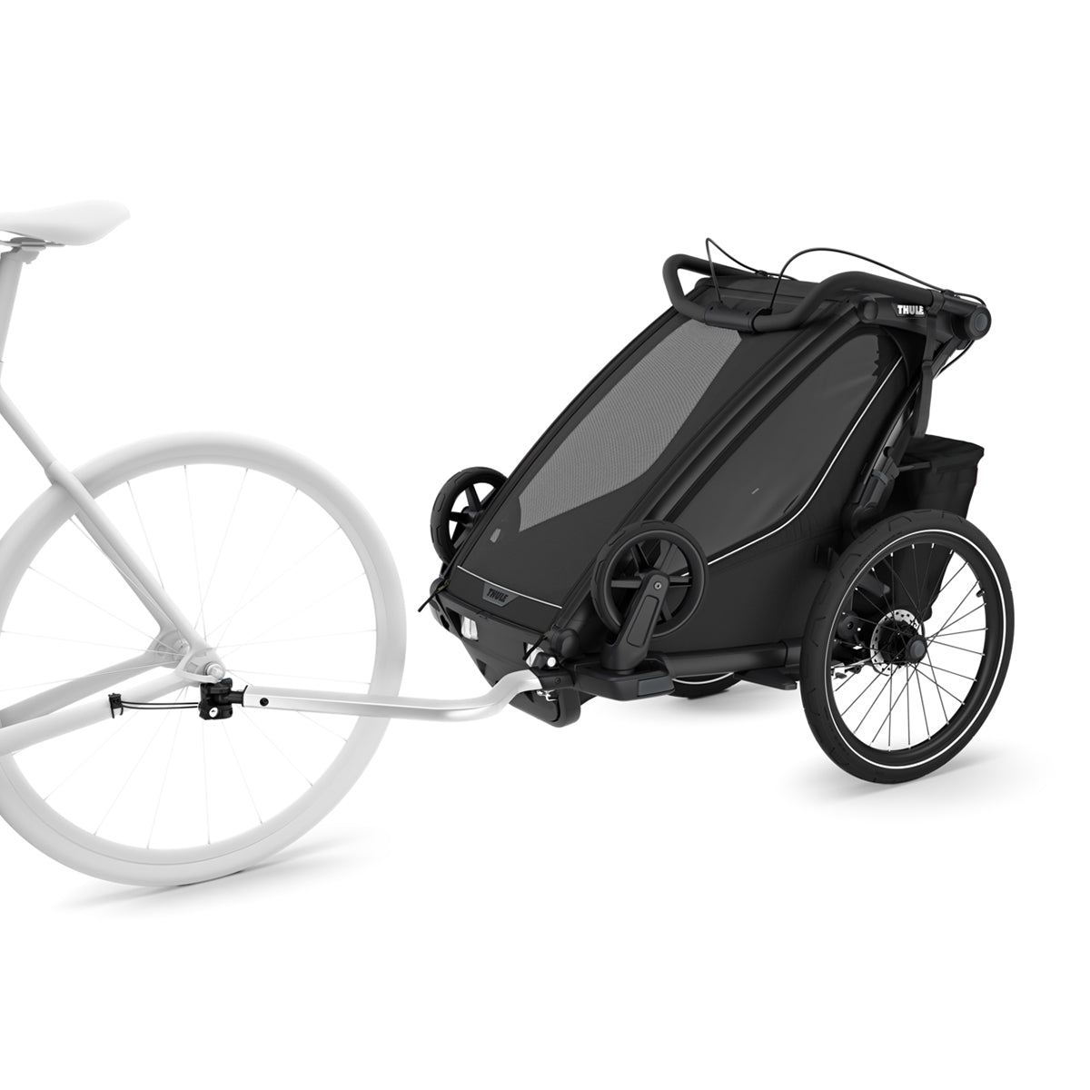 Sistemul Thule FlipWing - permite comutarea si mai usoara intre ciclism si plimbare si inapoi, acum cu posibilitatea de a rasturna rotile in sus si in jos in timp ce remorca este atasata la bicicleta